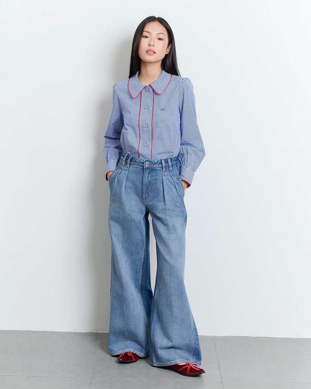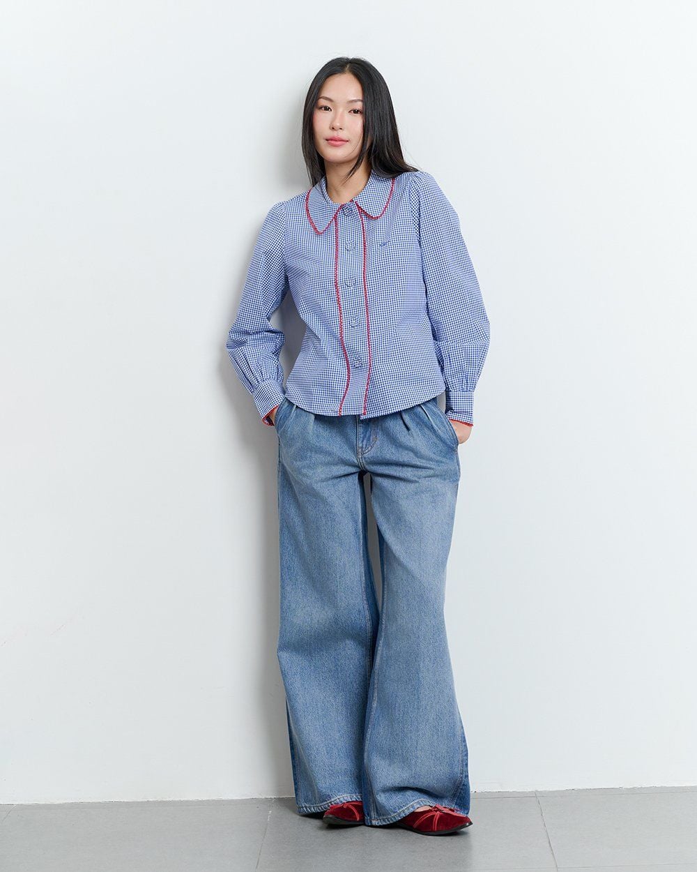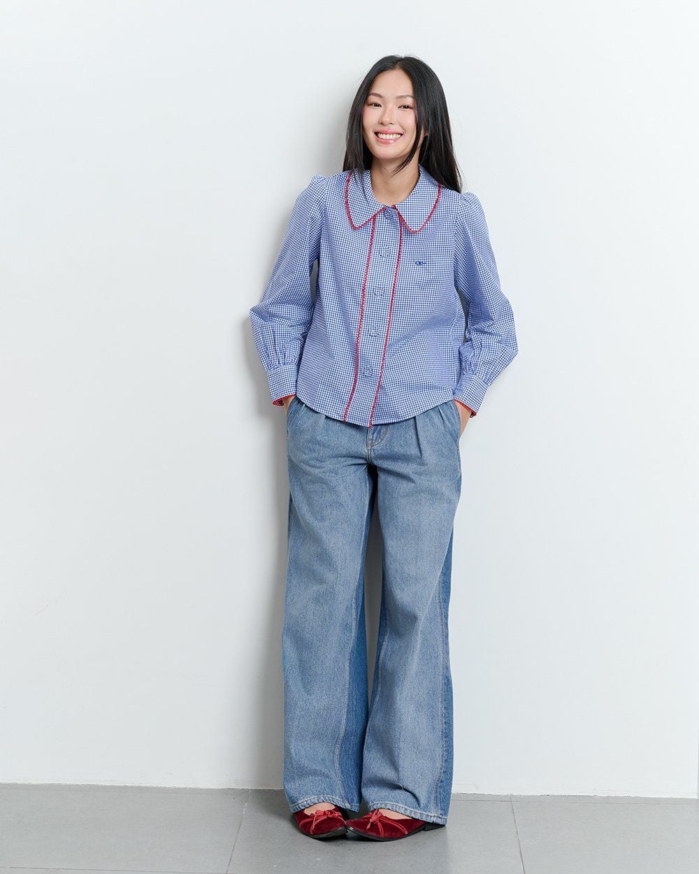 - Thiết kế: Áo tay dài phồng, cổ peter pan, nút bọc phong cách vintage