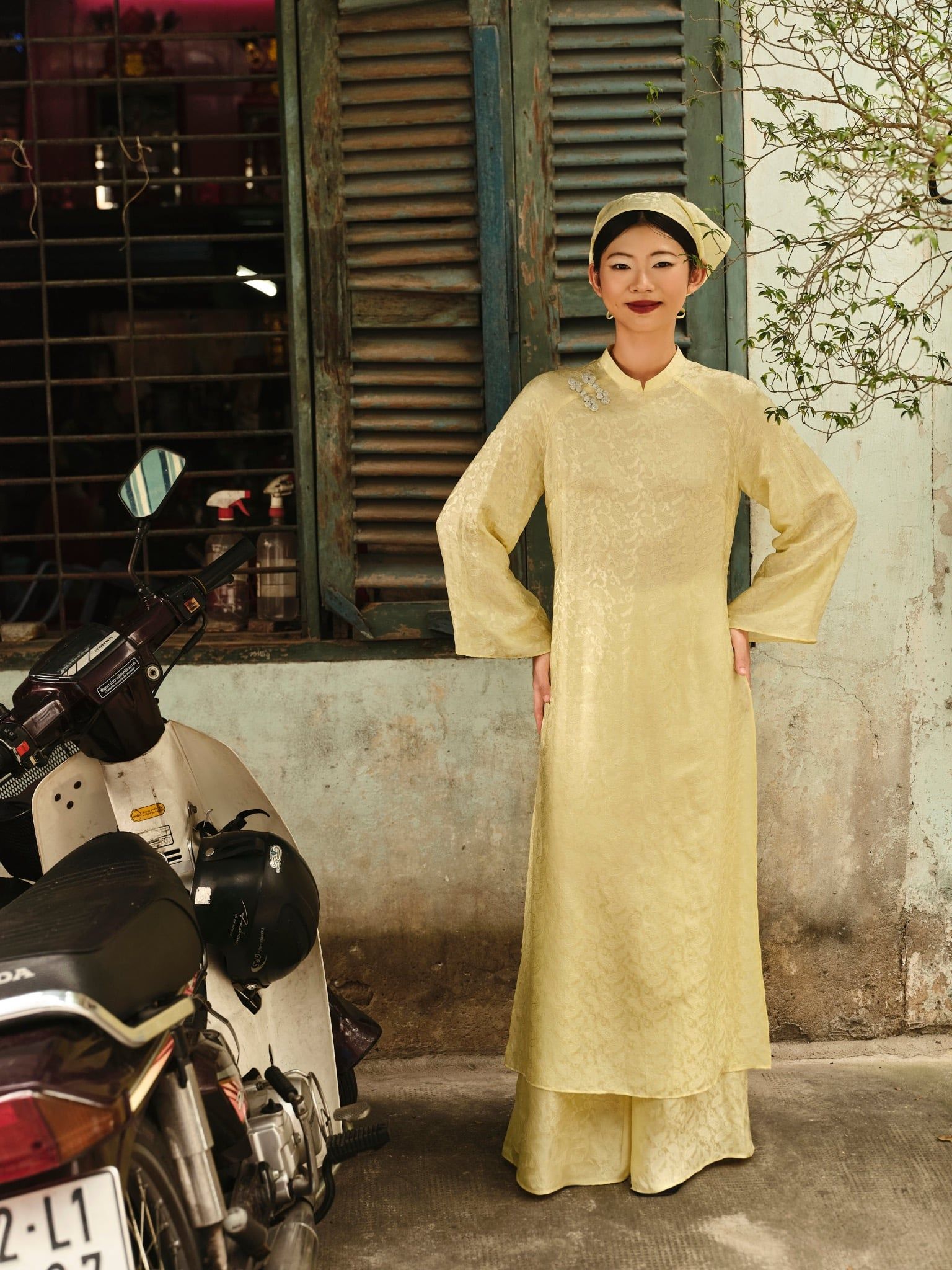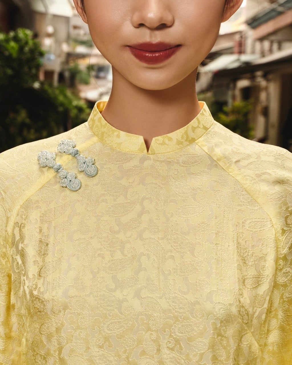 - Thiết kế: Cổ áo truyền thống, có dây kéo ở thân sau, tà áo dài rộng, đính nút trang trí