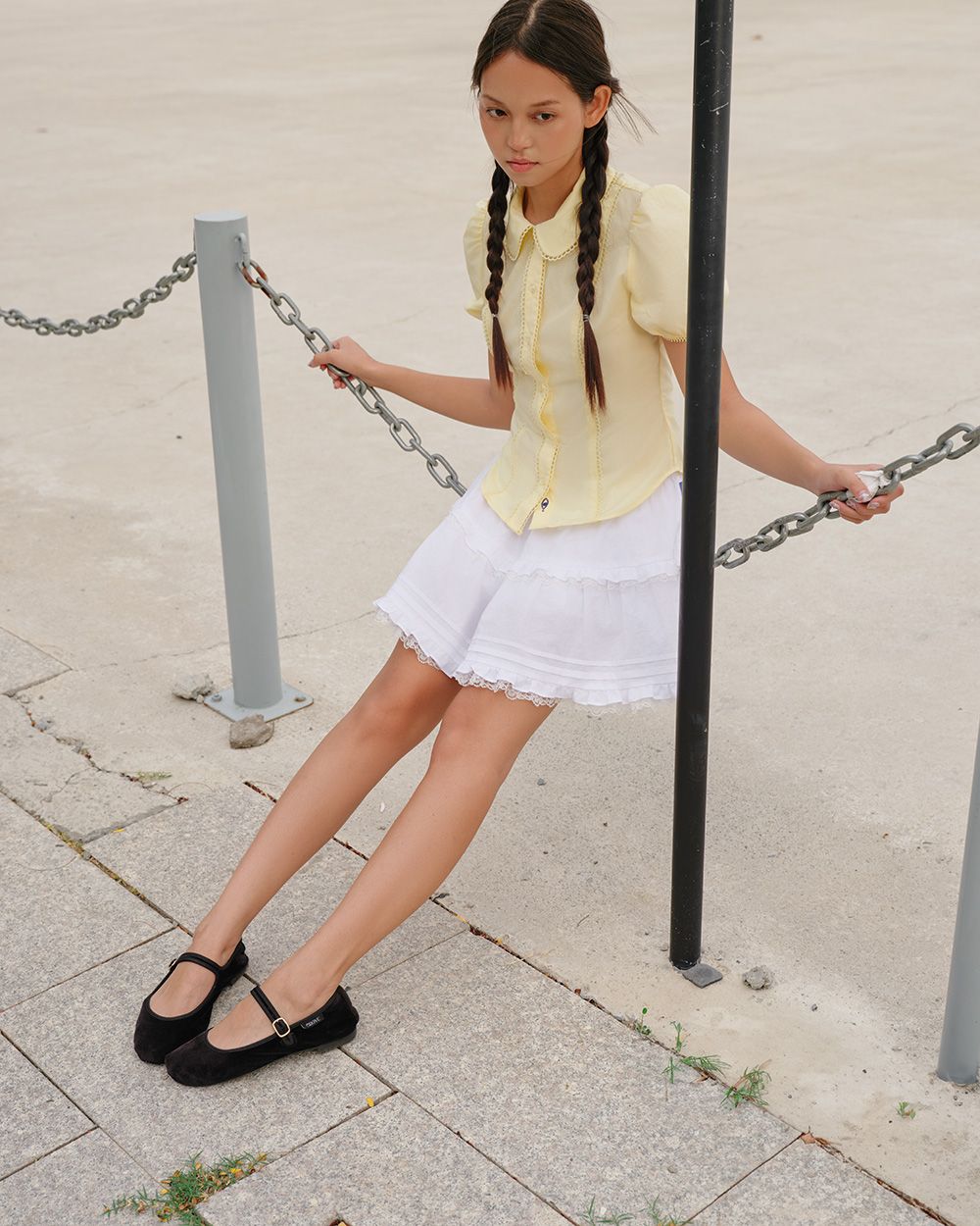 - Thiết kế: Áo cổ peter pan, tay phồng, đường decoup ở thân trước áo