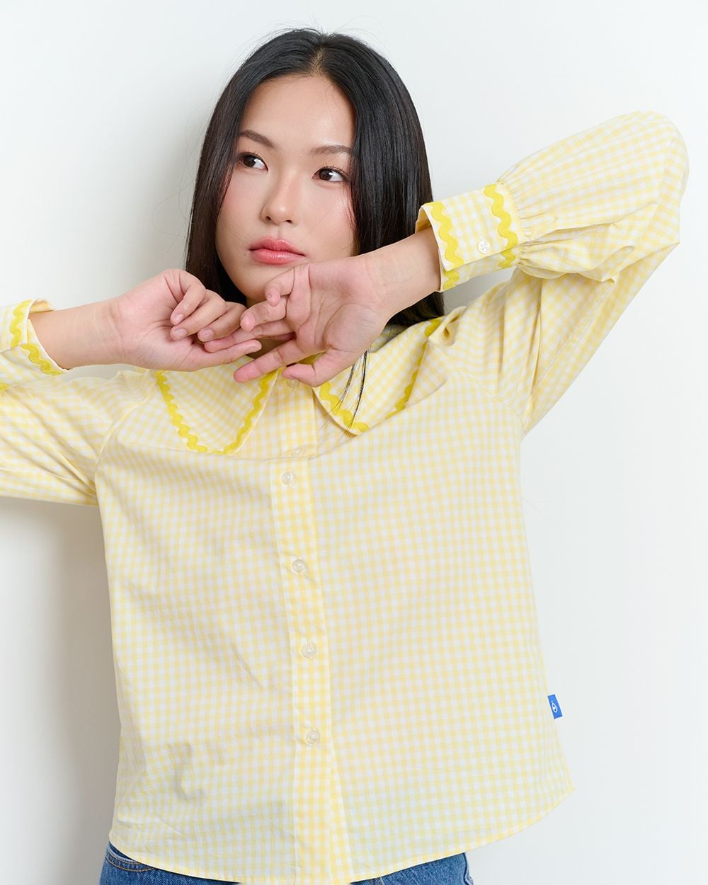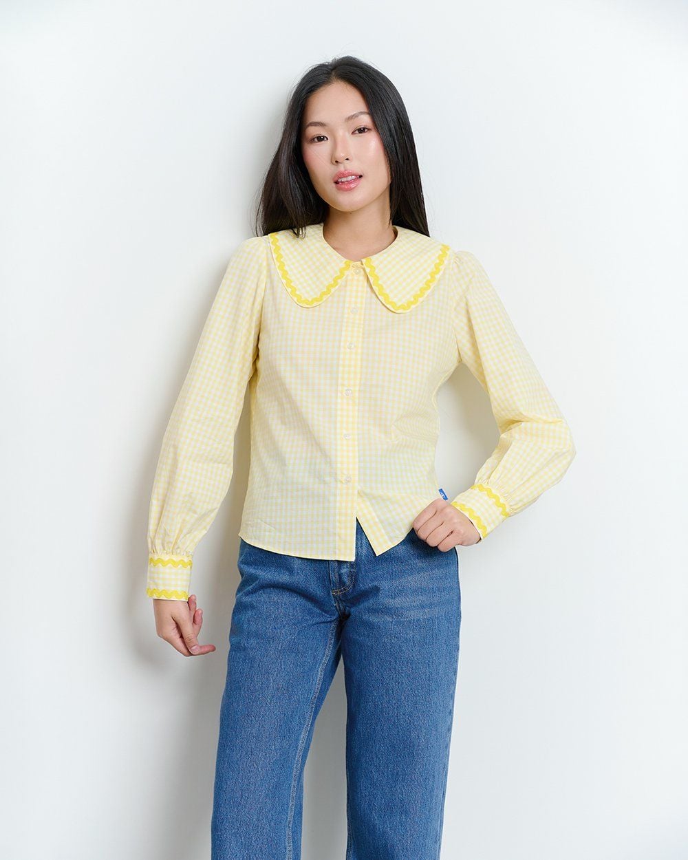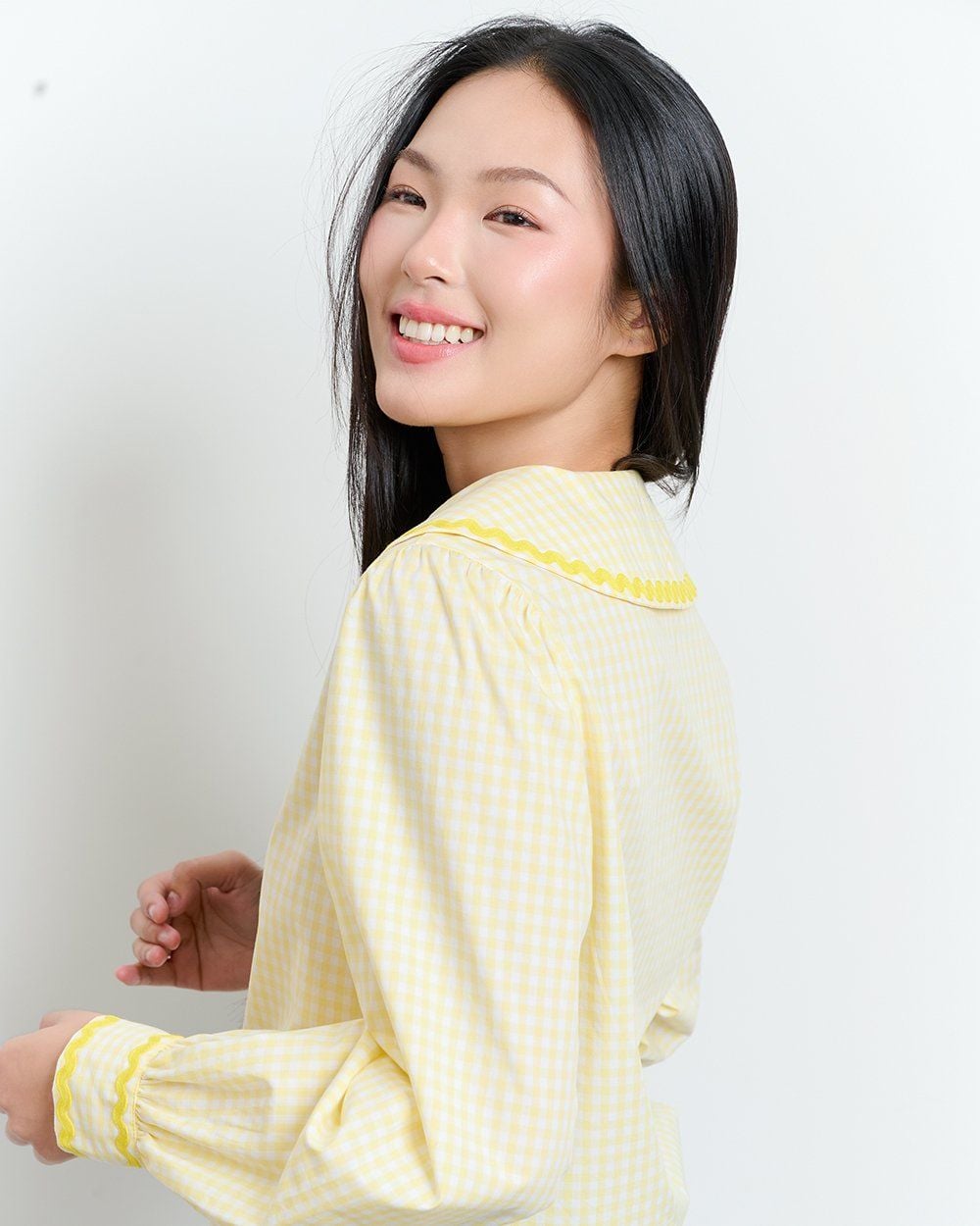 - Thiết kế: Áo tay dài phồng, cổ peter pan