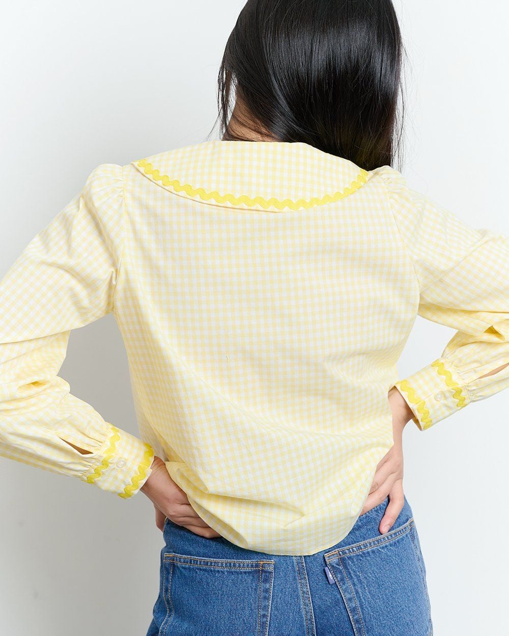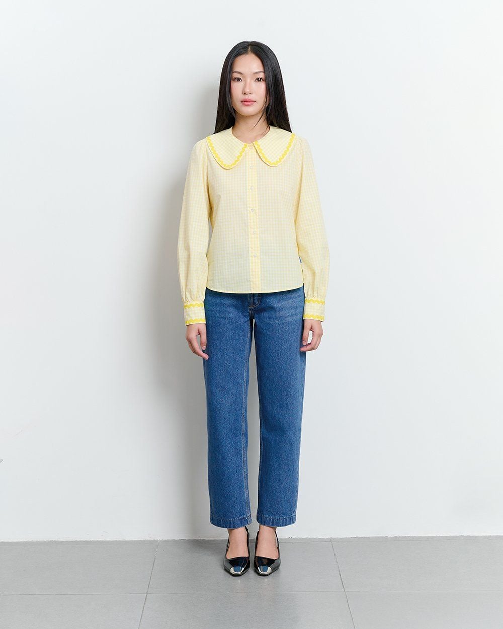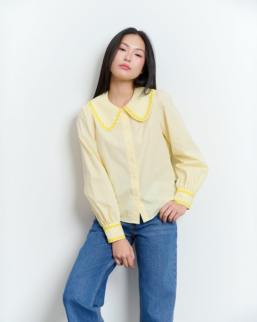 - Thiết kế: Áo tay dài phồng, cổ peter pan