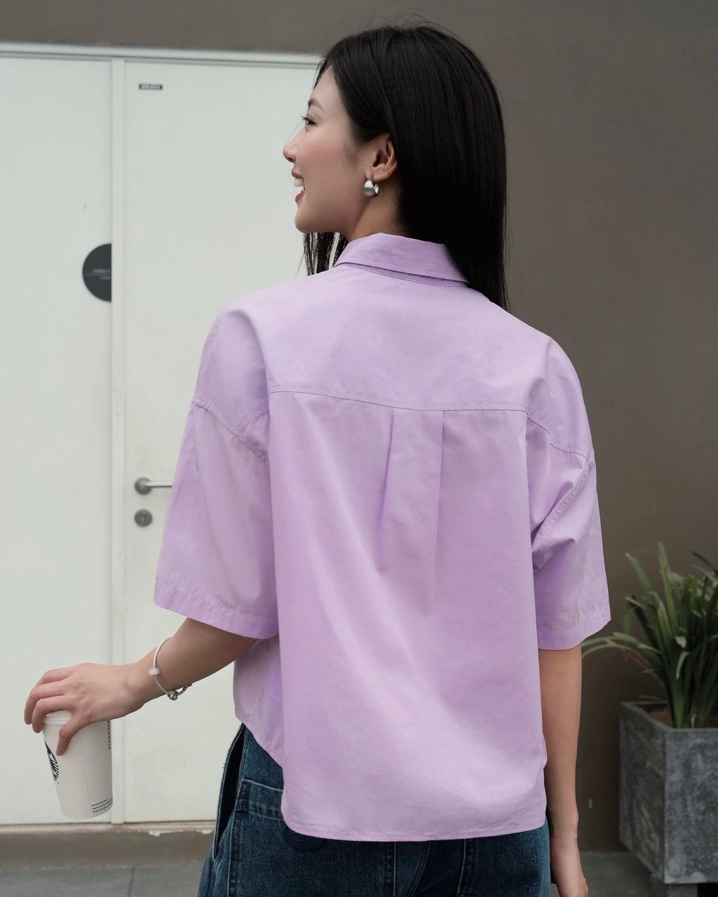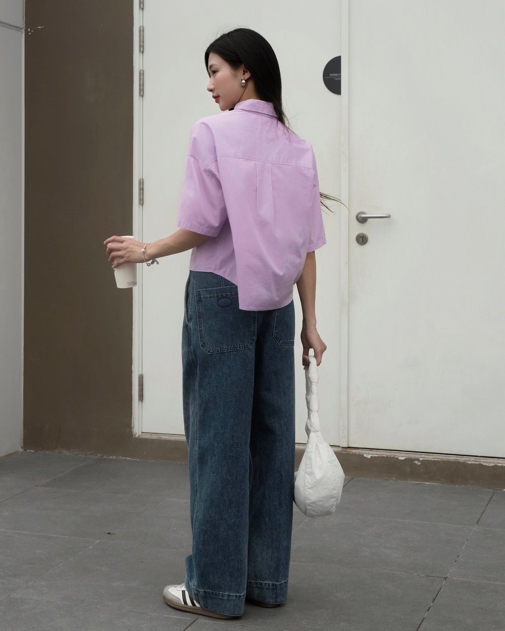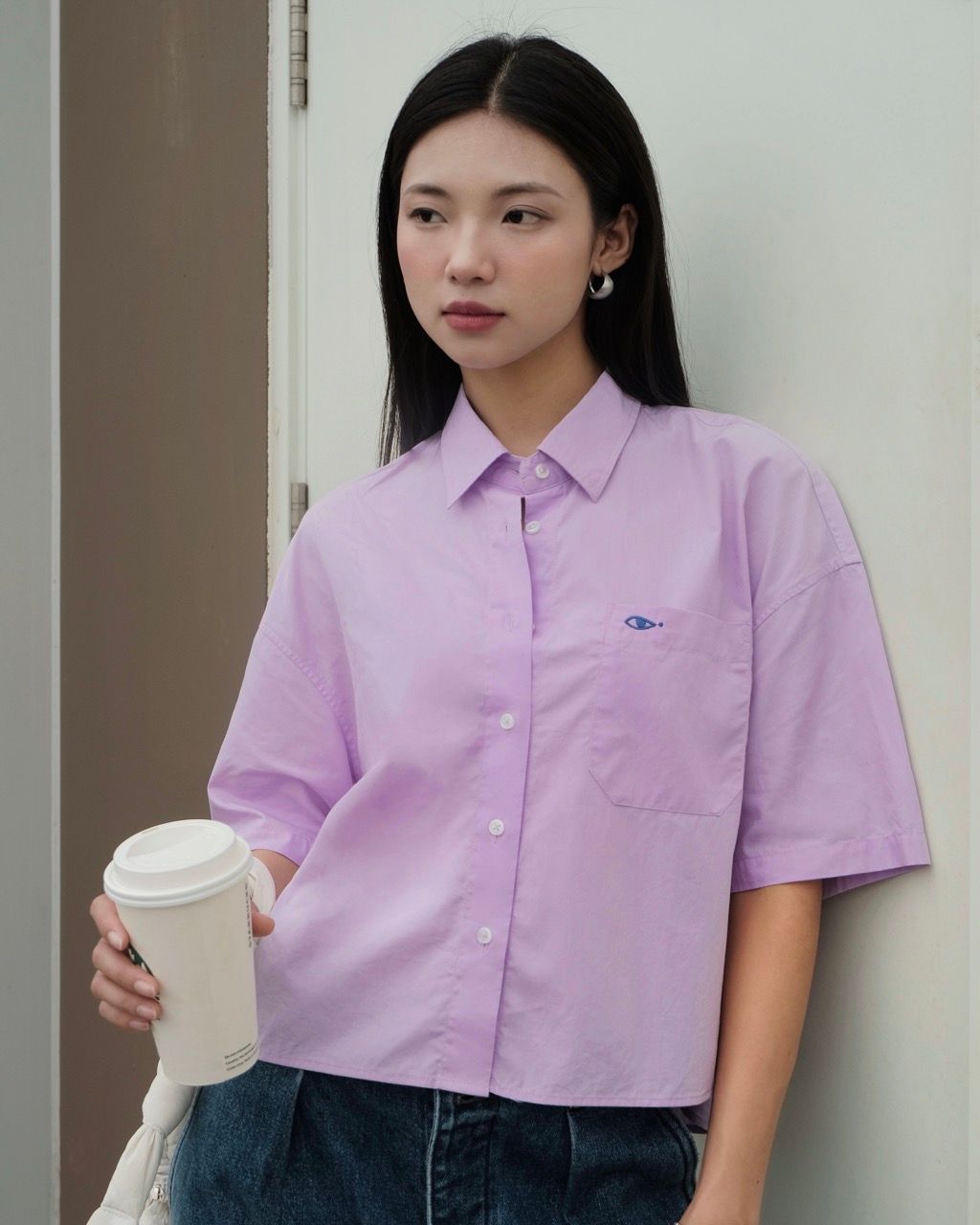 - Thiết kế: Áo sơ mi rộng rãi có túi vuông, vai trễ (dropped shoulder)