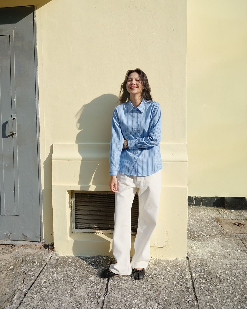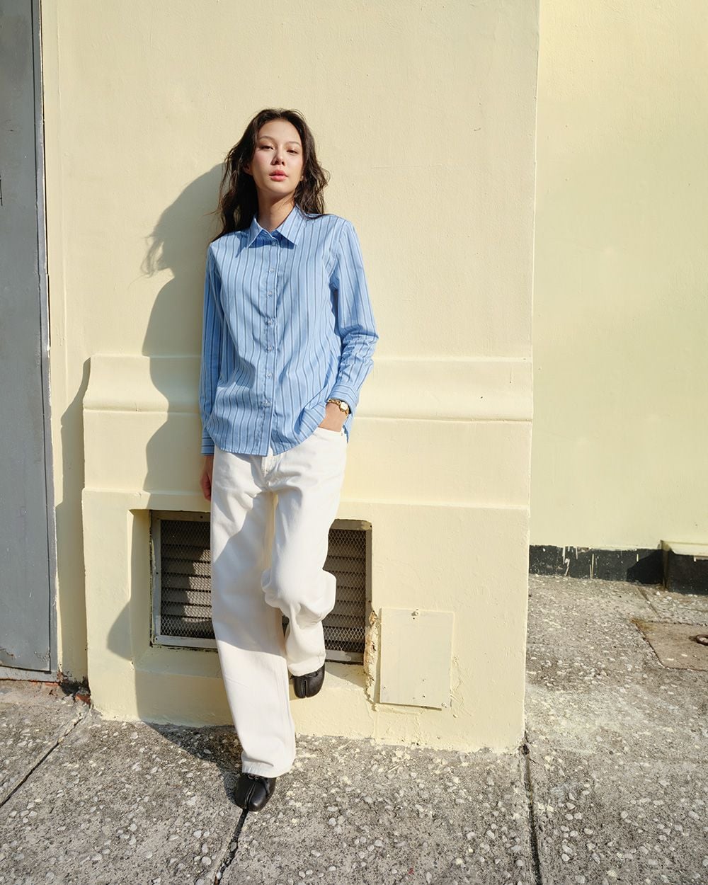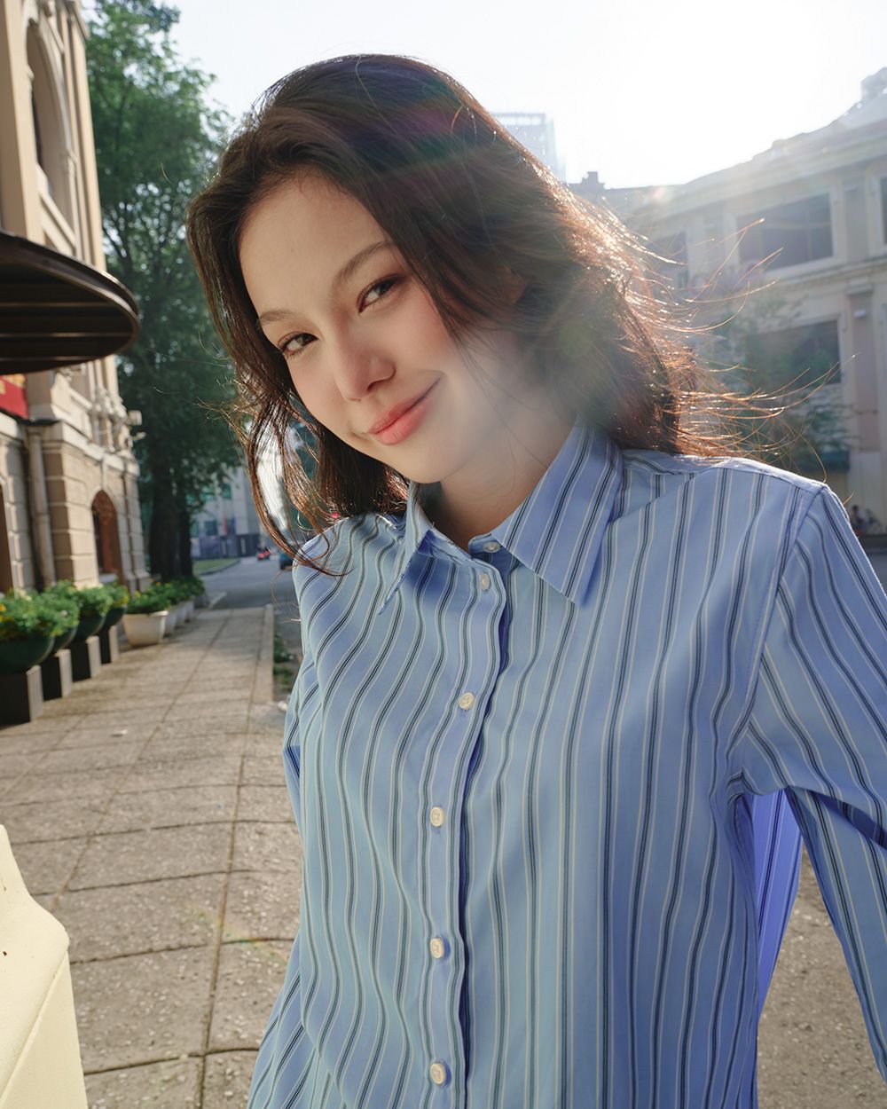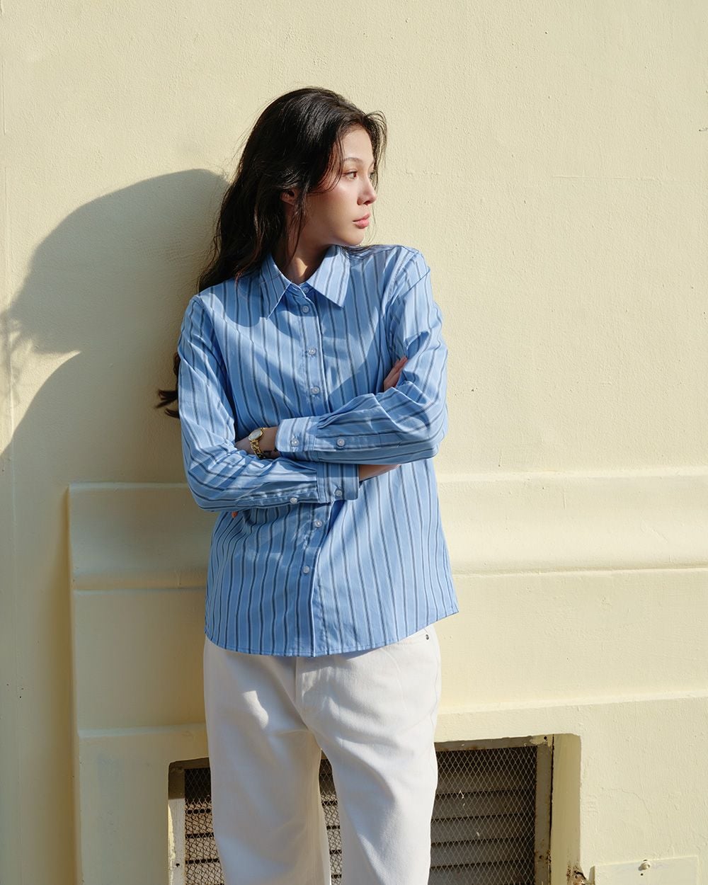 - Thiết kế: Sơ mi tay dài cơ bản, chiều dài qua mông, lai áo bầu