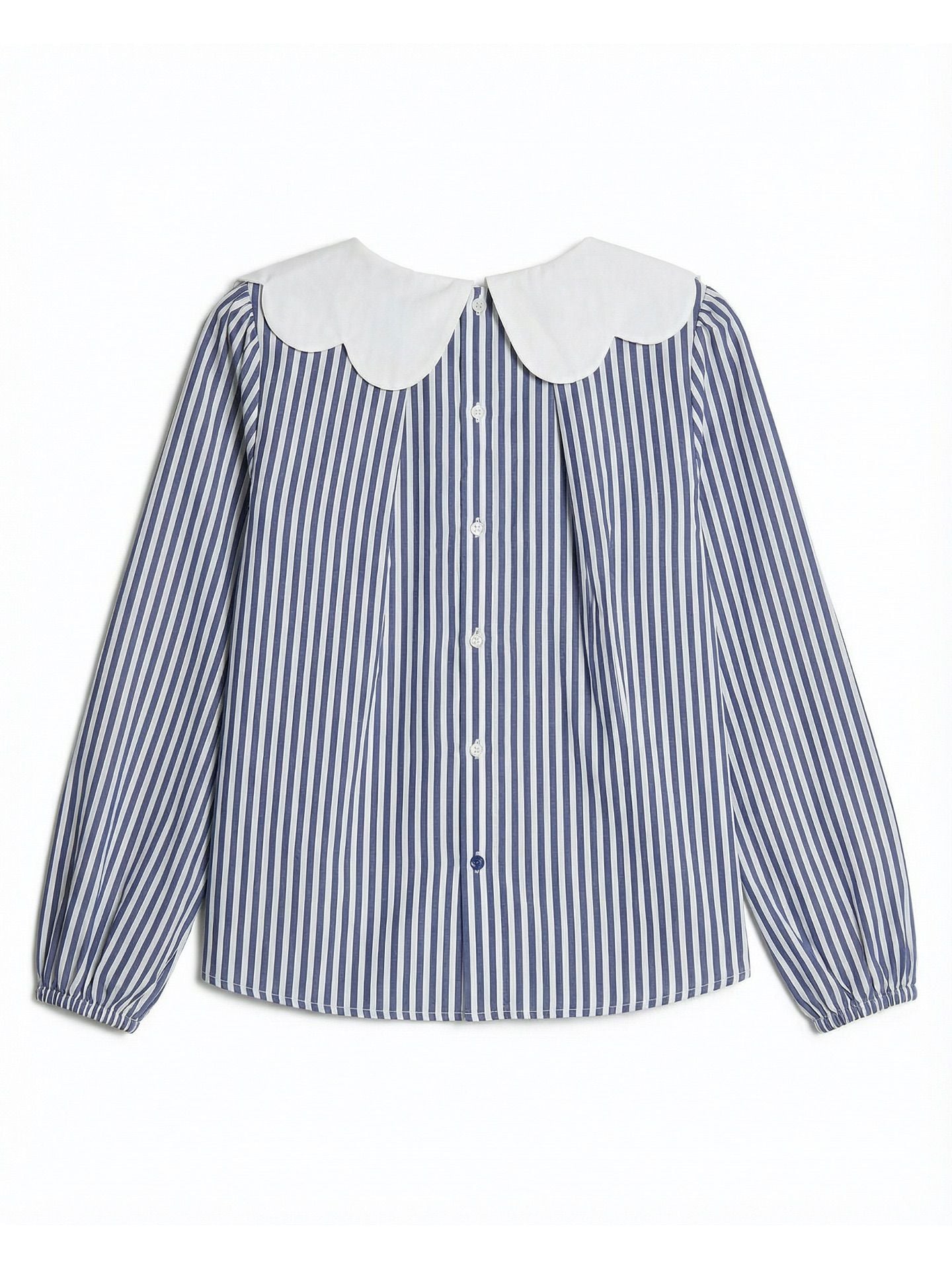 - Thiết kế: cổ peter pan cách điệu, tay phồng, thiết kế cài nút phía sau lưng (nút cuối màu xanh)