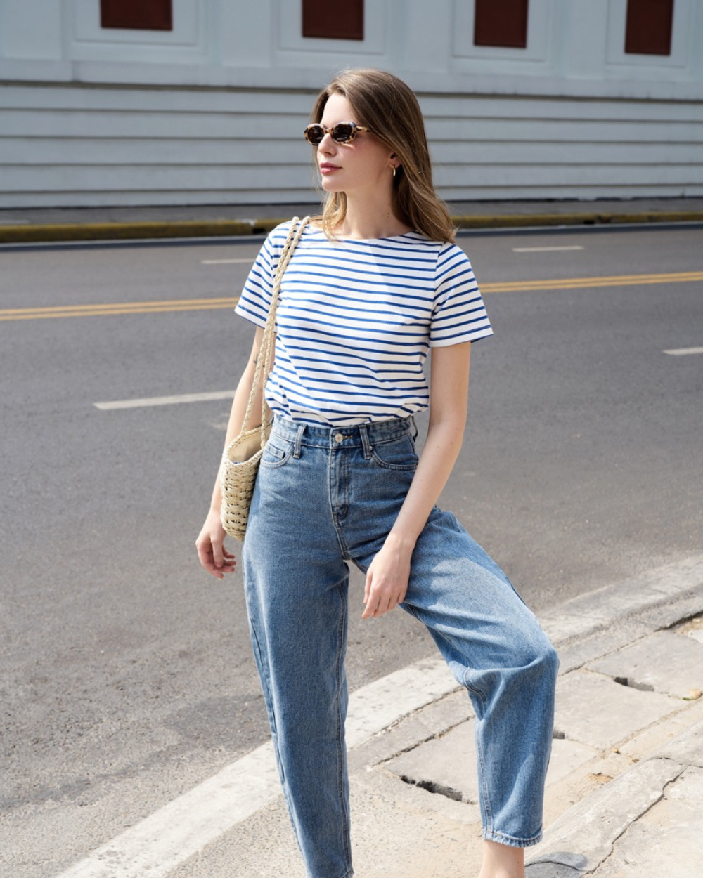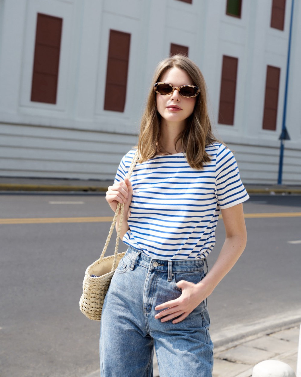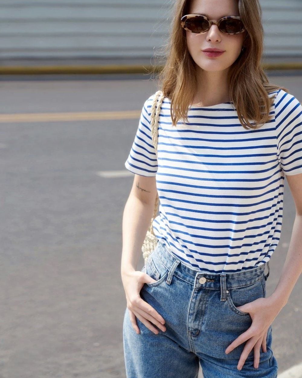 - Thiết kế: Tay ngắn, cổ thuyền, độ dài ngang hông