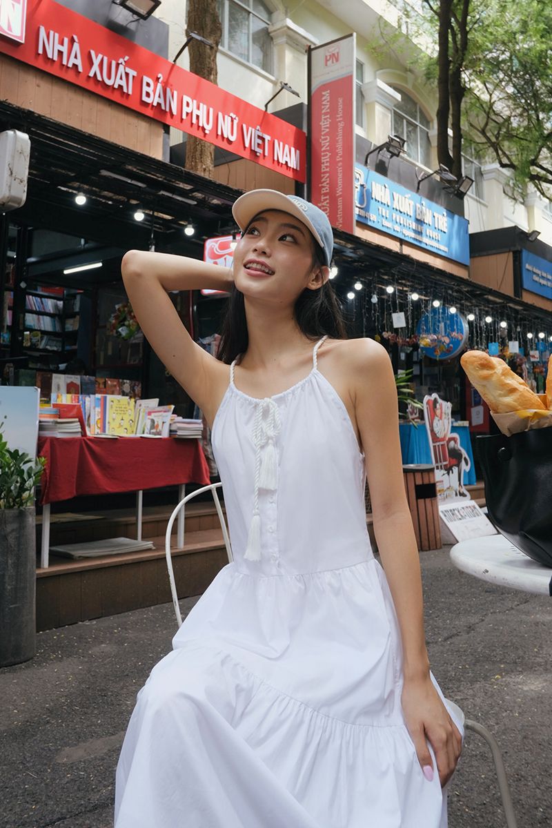 - Chi tiết: Gồm 2 túi bên hông, dây váy kết tua nối dài được luồn trong phần cổ, dễ dàng điều chỉnh co rút (tassel neckline)