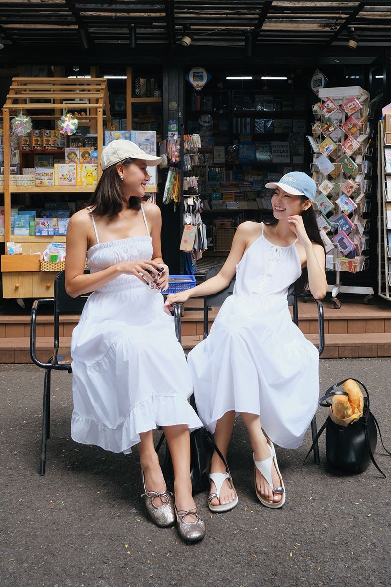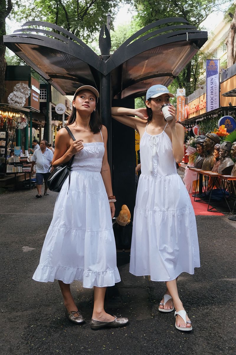 - Thiết kế: Đầm 2 dây, nách cắt sâu (American armhole), lưng thấp, tùng váy ruffle bồng bềnh