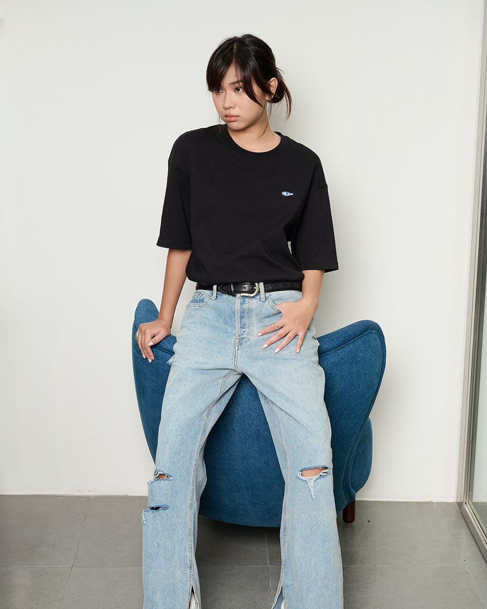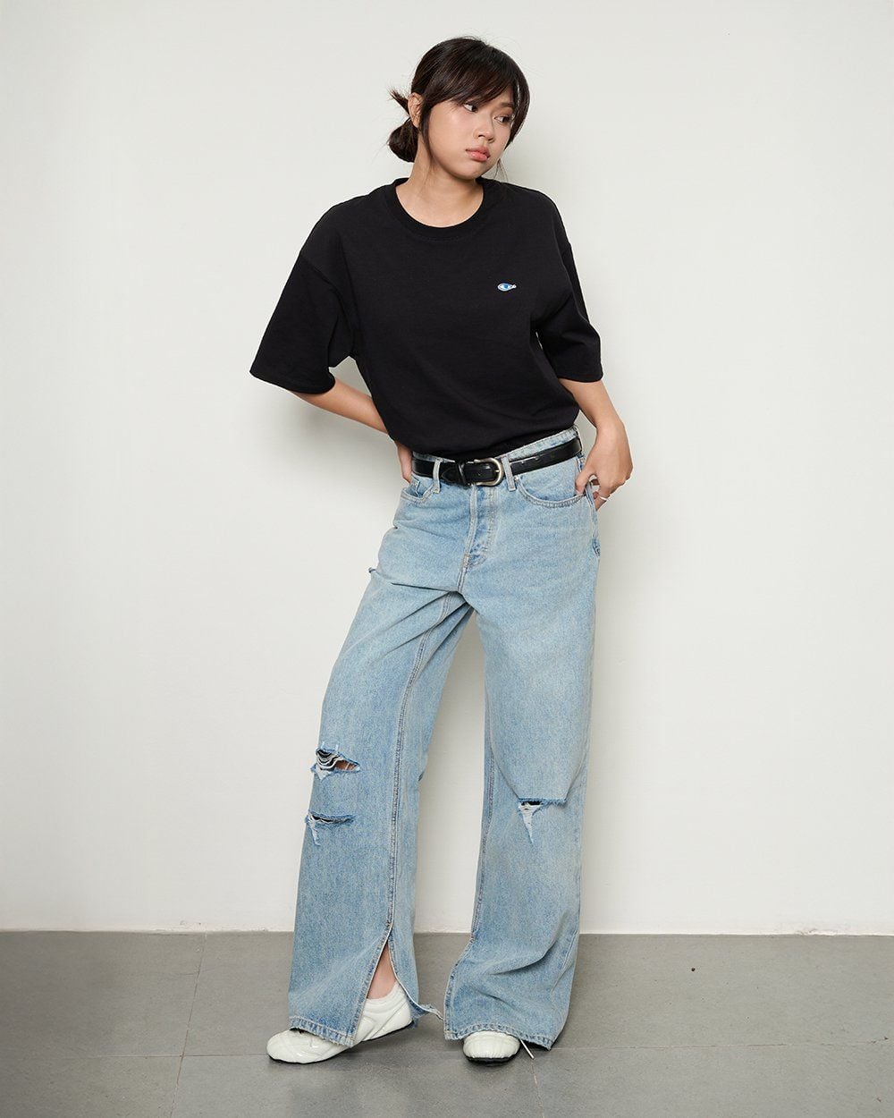 - Thiết kế: Ống suông có rách gối, ống quần xẻ ở dàn sườn trong
